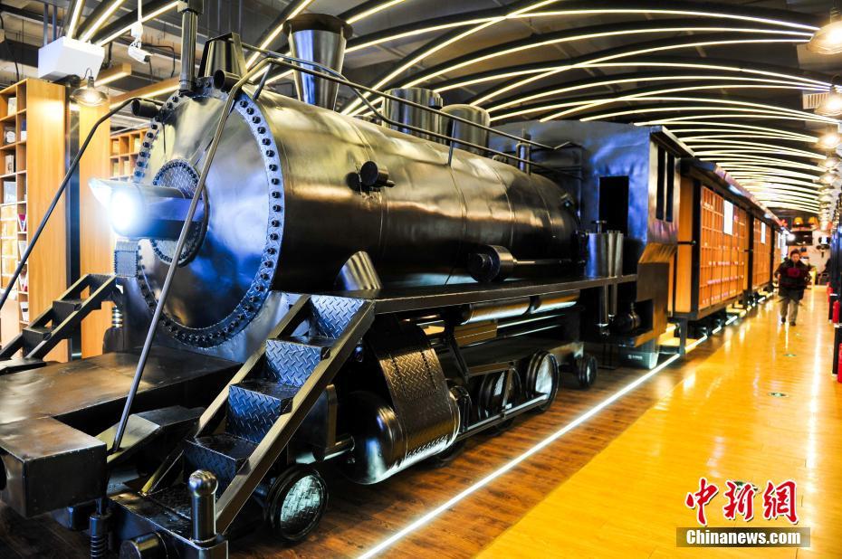2月6日,辽宁沈阳,市民在火车造型旁看书。在沈阳一书店的大厅里,摆放着被称作“文学列车”的巨大蒸汽火车头,火车头是老式的蒸汽机车,车厢则由一排排书架连接起来。 中新社记者 于海洋 摄