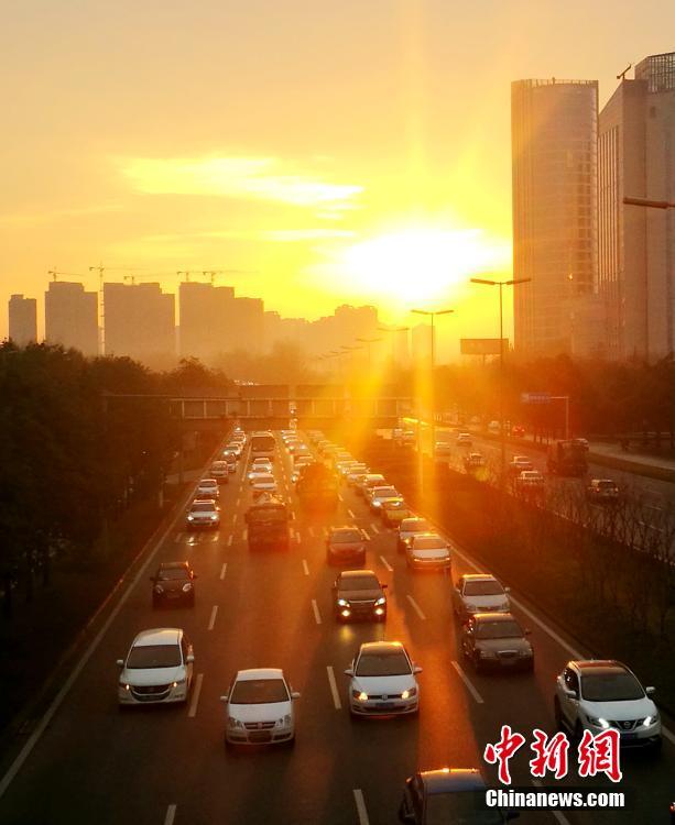 2月8日清晨,成都三环路穿行在金色阳光中的汽车。当日,四川成都市迎来节后好天气,红日如火,美不胜收。中新社记者 刘忠俊 摄