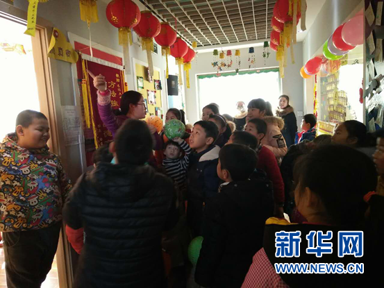 2月12日,河南省安阳市大千少儿书画学校里的孩子们在老师的指导下一起玩猜灯谜游戏。当日,安阳市大千少儿书画学校举办了别开生面的闹元宵活动。新华网记者 郭丹 摄
