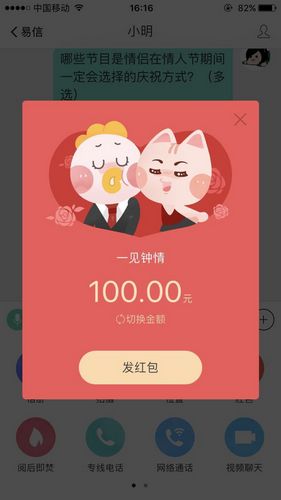 “这已经是我和男票一起度过的第三个情人节,大餐+玫瑰是我们的保留节目,不过最开心的还是早晨收到男票的表白红包,好鸡冻,感觉一整天都是粉红色的呢!” 易信网友“奈奈”留言表示。