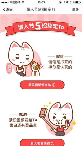 相比于各种庆祝方式,单身男女们则更坦言能有一个陪伴一生的爱人才是情人节最好的礼物。对此,易信针对情人节也推出相关活动——“情人节5招搞定Ta”,通过最美情话、真人表白、红包示爱、限量情侣公仔、亲密电话五大专区教你get情人节必备技能。