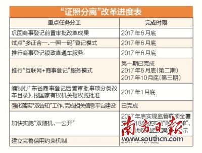 方案要求,今年6月底前全面总结评估“证照分离”改革试点工作情况,特别是商事登记后置审批分类改革工作经验,在全省范围内复制推广,试点“多证合一、一照一码”登记模式,推行商事登记银政直通车服务;到年底实现监管事项全覆盖,建立完善信用约束机制。