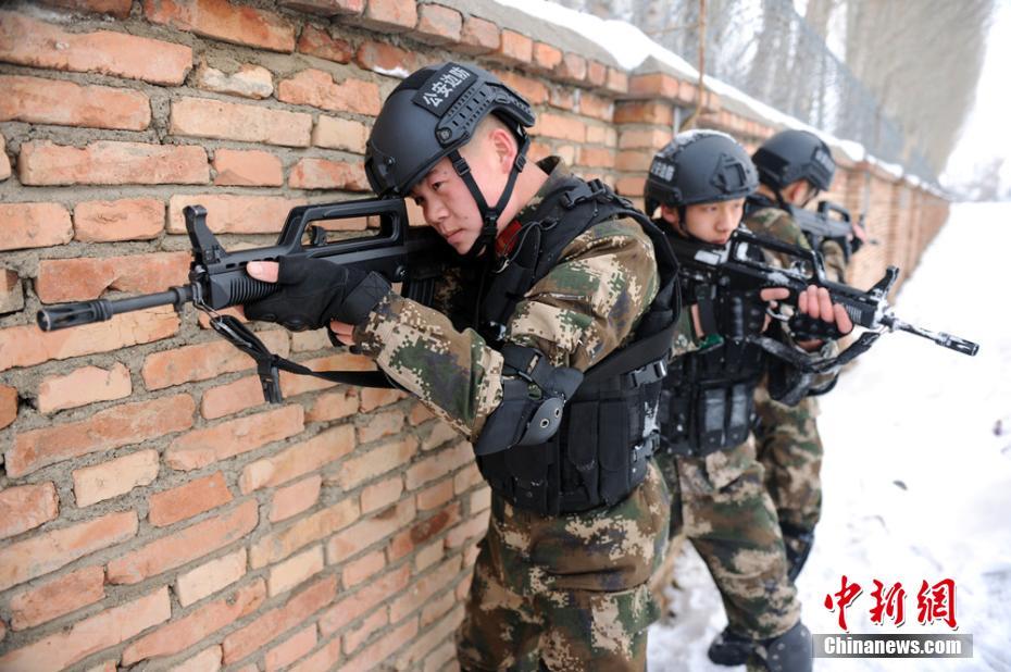 连日来,新疆塔城地区出现持续降温降雪天气。2月15日,新疆巴克图边防检查站在“林海雪原”中展开拉练,重点训练官兵处置突发事件、班组战术、防袭击演练等能力,以实战的角度提升部队在恶劣环境下的作战技能。图为三人小组战术训练。 马丁 摄
