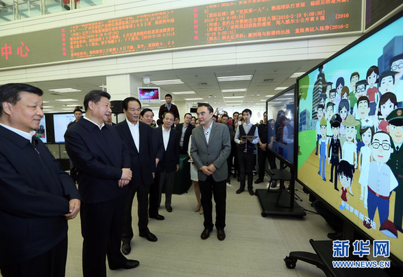 2016年2月19日,中共中央总书记、国家主席、中央军委主席习近平在北京主持召开党的新闻舆论工作座谈会,并到中央新闻单位调研。这是习近平在新华社观看新闻信息产品展示。新华社记者 兰红光 摄