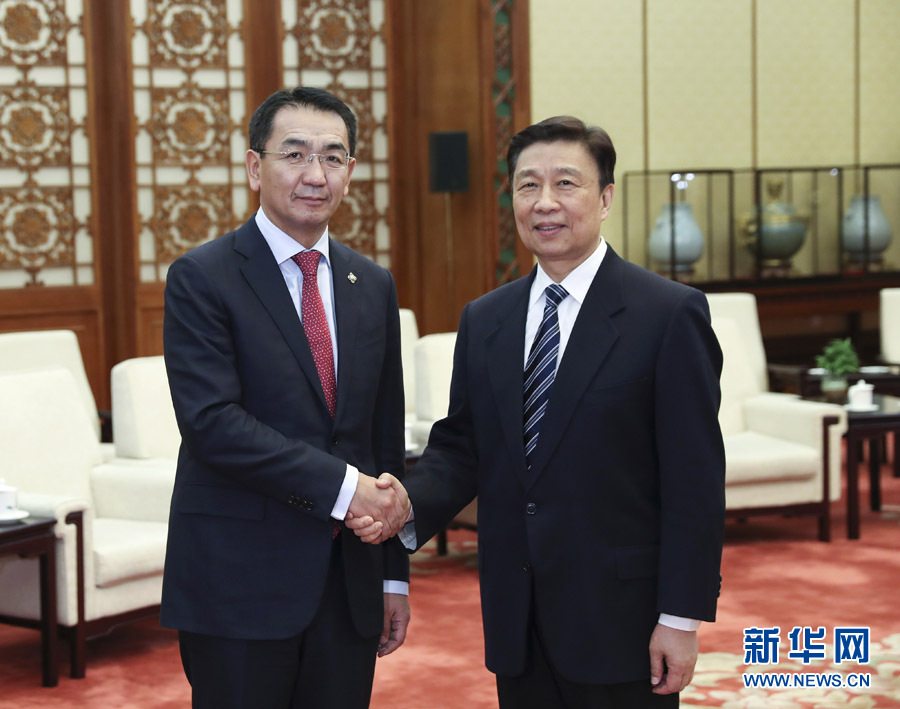 2月20日,中国国家副主席李源潮在北京会见来华访问的蒙古国外长蒙赫奥尔吉勒。 新华社记者 庞兴雷 摄