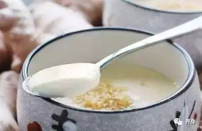 将生姜榨汁,取生姜汁2-3勺,倒入半斤煮沸的牛奶中。