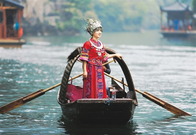 湖南张家界宝峰湖景区歌手在乌蓬船上唱山歌。