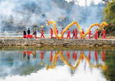 在贵州省贵阳市花溪区马铃乡马铃村水车坝布依寨的“布依风情节”上,布依族人唱着山歌,舞着长龙。