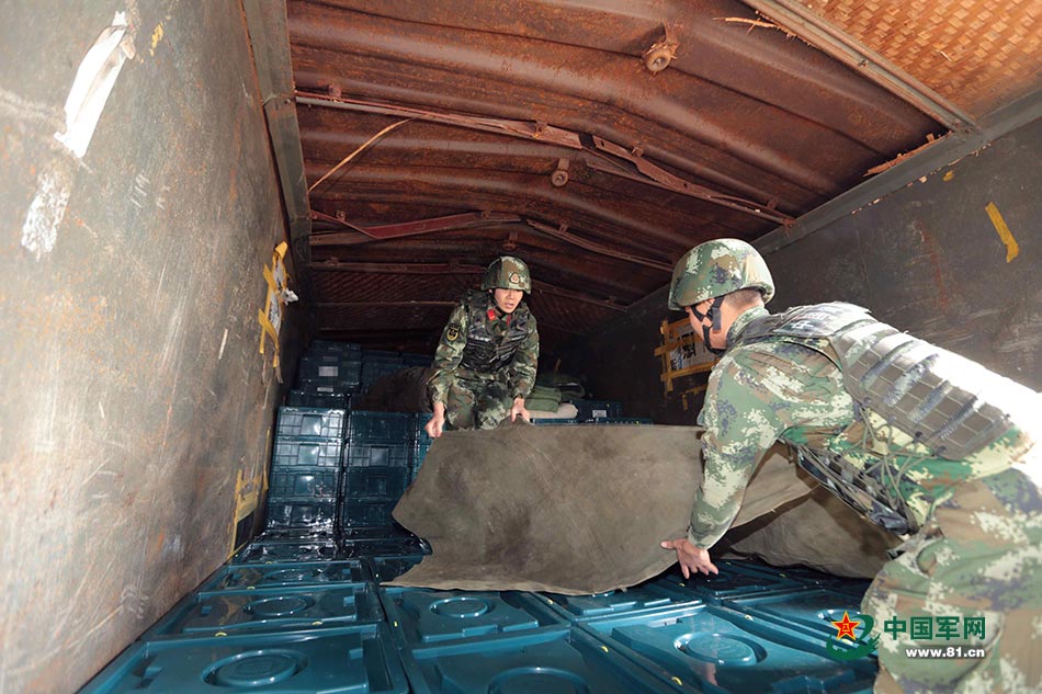 出发前,战士们将随车携带的生活用品装载进闷罐车厢。特约记者李光印 摄