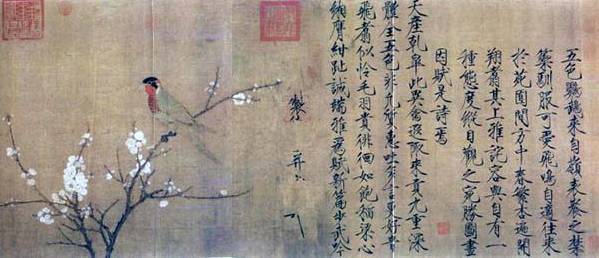 除了书法,赵佶自幼还喜欢绘画艺术。他在十六七岁时就以其不凡的艺术成就在当时的书画界声誉鹊起,他即位后更是乐此不疲,在绘画上倾注了大量心血。宋徽宗主张形神并举,提倡诗、书、画、印结合,他是工笔画的创始人,花鸟、山水、人物、楼阁,无所不画。他用笔挺秀灵活,舒展自如。他注重写生,体物入微,以精细逼真著称,相传他曾用生漆点画眼睛,令画面更加生动、栩栩如生。宋徽宗的画自成“院体”,备受当时人的推崇。他曾自诩说:“朕万几余暇,别无他好。惟好画而。”