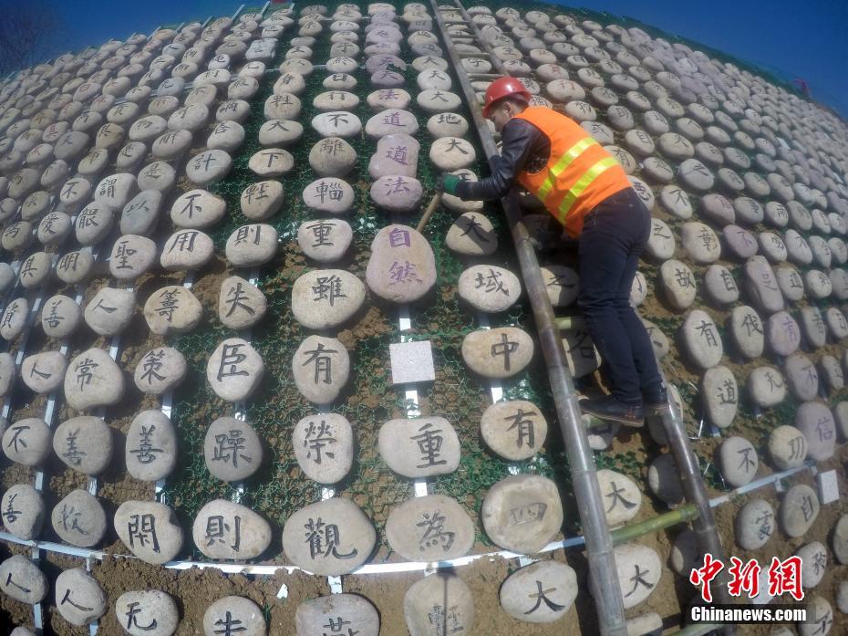 2月24日,河南济源王屋山,由五千余块石头刻出的道德经在原土墙壁上进行安装,百余人穿“盔甲”登云梯作业,场面壮观酷似攻城大片。据介绍,这部原土石刻《道德经》长101米,寓意老子在世101载,高8.1米寓意《道德经》81章,刻字用的石头取自王屋山中散落的天然五彩石,大小共计5210块,将于今年的3月12日(农历二月十五)老子诞辰日之前安装完毕。中新社记者 王中举 摄
