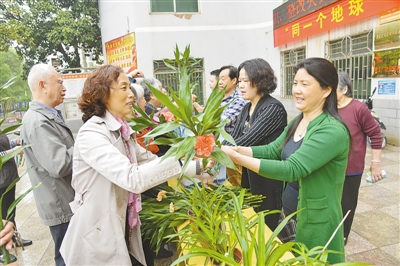 江西新余渝水区电工厂社区,居民们在用废电池换鲜花绿植。人民视觉
