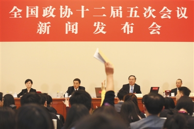 昨日,全国政协十二届五次会议新闻发布会,新闻发言人王国庆(右二)介绍本次大会有关情况并回答记者提问。新京报记者 侯少卿 摄
