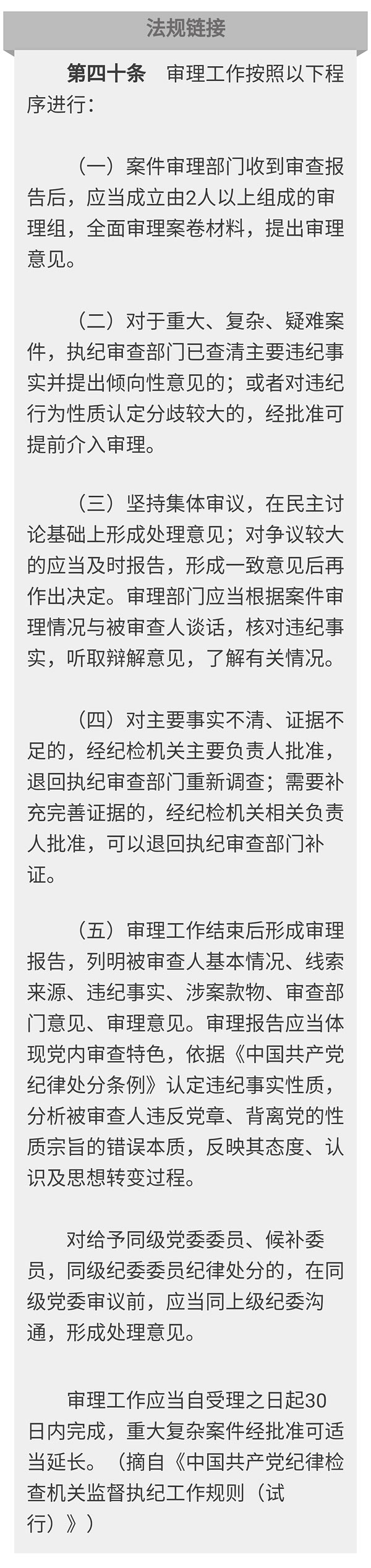 执纪审理工作是纪律审查工作的最后关口。不久前公布的《中国共产党纪律检查机关监督执纪工作规则(试行)》对审理工作程序进行了明确规范。审理工作应严格依规依纪,提出纪律处理或者纪律处分的意见,做到事实清楚、证据确凿、定性准确、处理恰当、手续完备、程序合规。