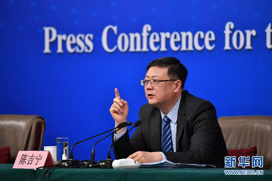 3月9日,十二届全国人大五次会议新闻中心举行记者会,邀请环保部部长陈吉宁就“加强生态环境保护”的相关问题回答中外记者的提问。这是陈吉宁在回答记者提问。新华社记者 李鑫 摄