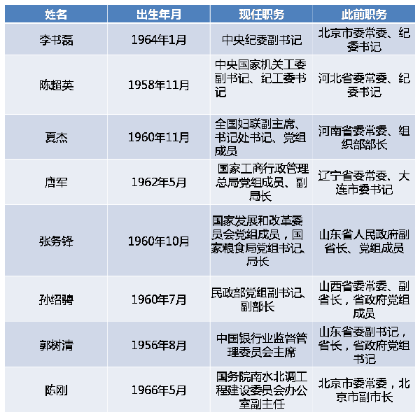 今年1月份,李书磊在经过闽、京两地历练之后,调任中纪委,出任中纪委副书记。接着,时任河北省委常委、纪委书记陈超英进京任职,履新中央国家机关工委副书记、纪工委书记。2月份,时任河南省委常委、组织部部长夏杰调任全国妇联副主席。