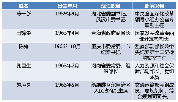 从中央到地方任职的5人中,4人为“60后”,2人为“65后”。其中,最年轻的是重庆市委常委、纪委书记陈雍,51岁,此前担任监察部副部长。