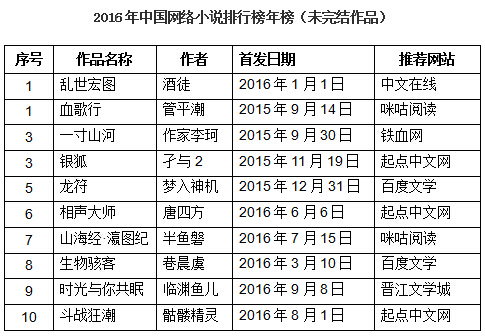 新华网北京3月16日电(记者 王志艳)16日上午,中国作家协会网络文学委员会在京发布了“2016年中国网络小说排行榜”。《男儿行》《云胡不喜》《雪中悍刀行》等10部作品入选已完结作品榜,《乱世宏图》《血歌行》《一寸山河》等10部作品入选未完结作品榜。