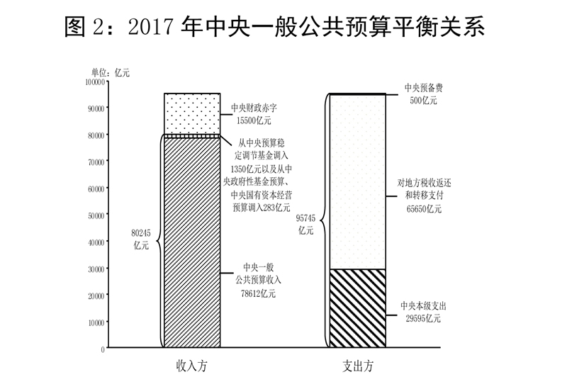 中央一般公共预算收入78612亿元,比2016年执行数同口径增长3.8%。加上从中央预算稳定调节基金调入1350亿元,从中央政府性基金预算、中央国有资本经营预算调入283亿元,收入总量为80245亿元。中央一般公共预算支出95745亿元,增长6.1%。收支总量相抵,中央财政赤字15500亿元,比2016年增加1500亿元。中央财政国债余额限额141408.35亿元。中央预算稳定调节基金余额1328.06亿元。