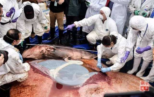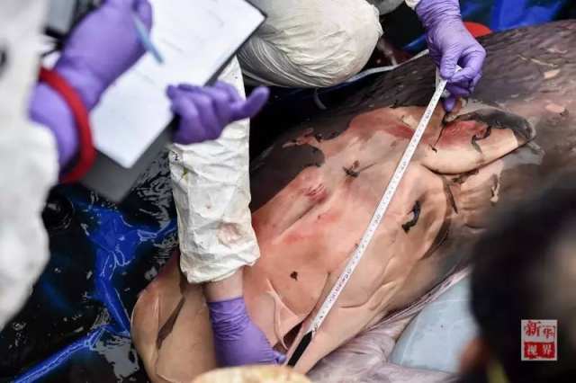 △3月16日,专家和工作人员在解剖抹香鲸。