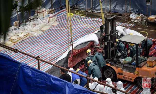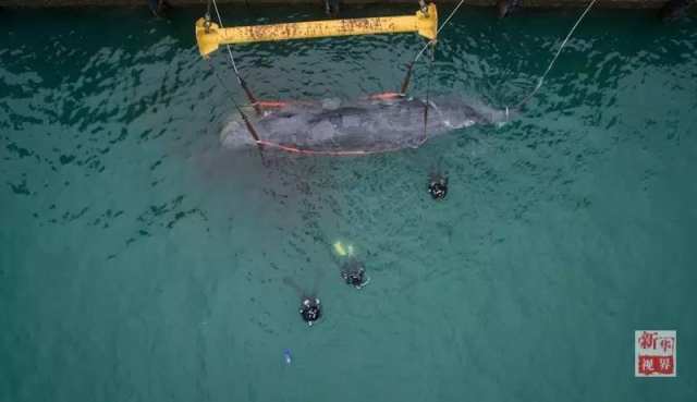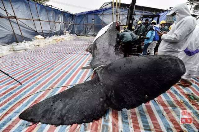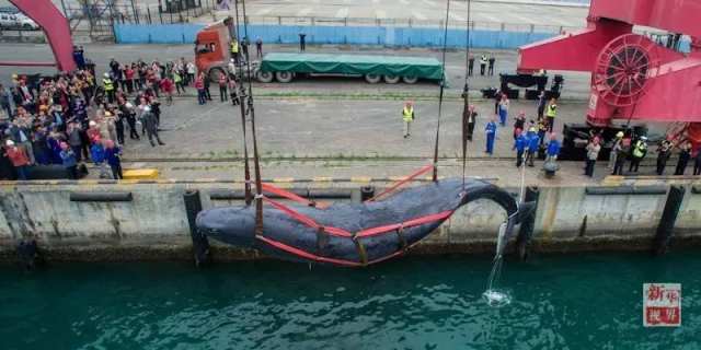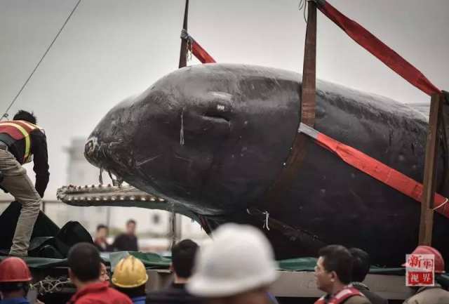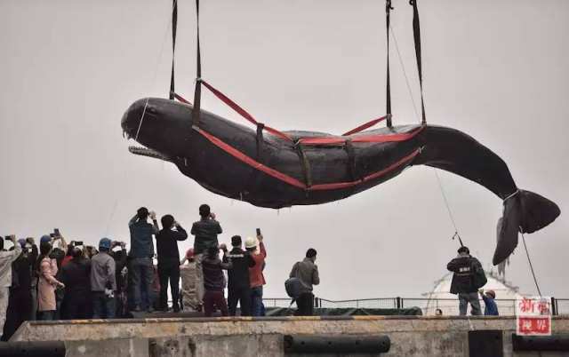 50吨的抹香鲸被制成两套标本运回其搁浅地如东