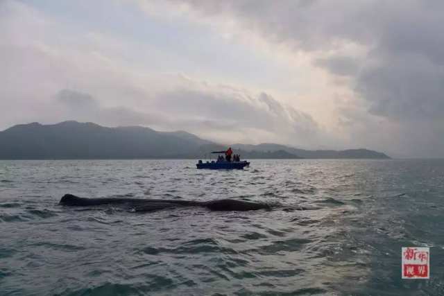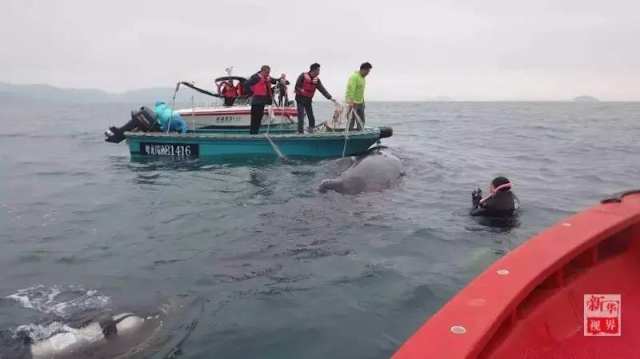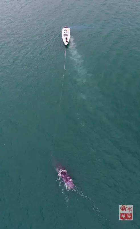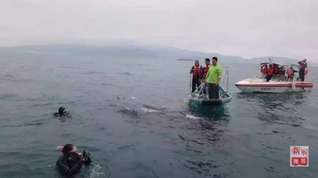 12时20分,在渔政人员和潜水员的共同努力下,被困鲸鱼成功获救。