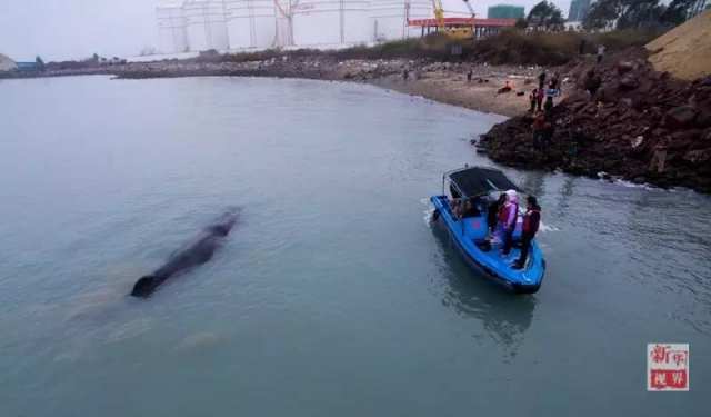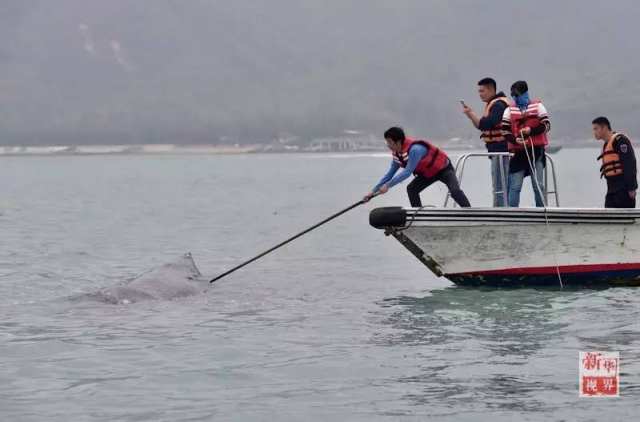 △3月14日,在惠州港油库码头附近海域,专家和工作人员查看游向浅滩的抹香鲸。