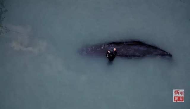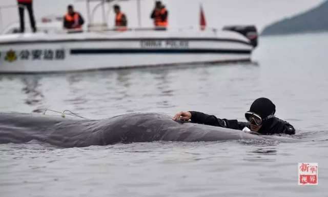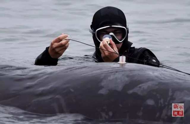 按照专家会商方案,潜水教练黄晨迪下到海中,在抹香鲸身上装上仪器,进行听觉测试,在安装仪器前,这位潜水教练拍了拍它的头,小心地装上了测试设备,又拍了拍它的身子,离开了。