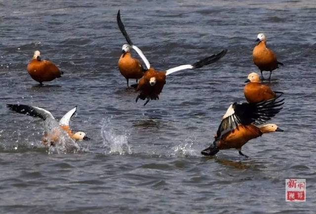 △水禽在松花江吉林市段水面上嬉戏。新华社记者 许畅 摄