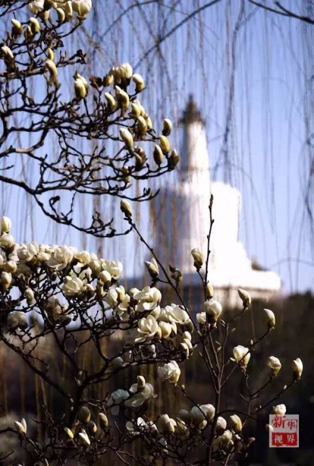△北海公园的白塔和盛开的玉兰花 新华社记者李欣摄