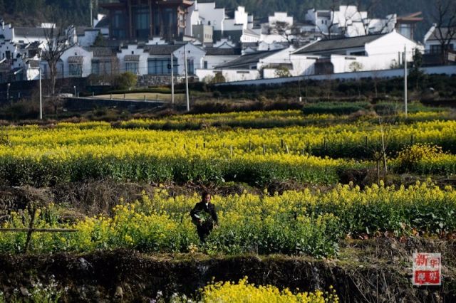 △一名村民在安徽省黄山市黟县卢村的油菜花田里劳作。新华社记者 张端 摄