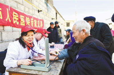 河北邢台市人民医院的医务志愿者组成爱心医疗小分队,为太行山区的留守、孤寡老人义诊。图为3月19日,医生正在为村里老人测量血压。记者 史自强摄