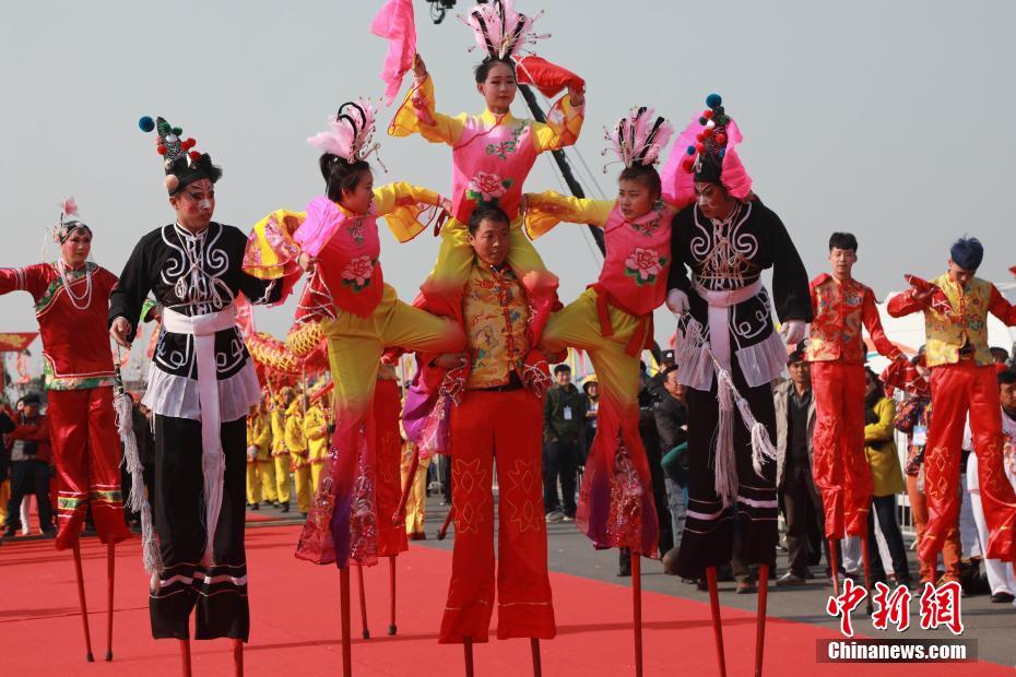 3月19日,辽宁省盘锦市,高跷表演。当日,盘锦市第二届二界沟开海节开幕。二界沟是中国北方著名天然渔港,此次开海节以二界沟独特的“古渔雁文化”为核心,透过古老的二界沟渔家祭祀、船工号子等非物质文化遗产,开启了渔民对新一年的期盼,还原了旧时二界沟渔民开海祭祀的盛大场景。?开幕式上,依次进行了舞龙、舞狮、秧歌、高跷、渔姑舞等地方民俗文化表演;渔民通过喊打蓬号子、迎龙王、分发五谷等方式,祈求航行平安、渔业丰收。 中新社记者 沈殿成 摄