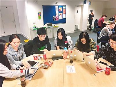 在留学时,薄梦(右三)在图书馆和同学一起讨论小组作业。