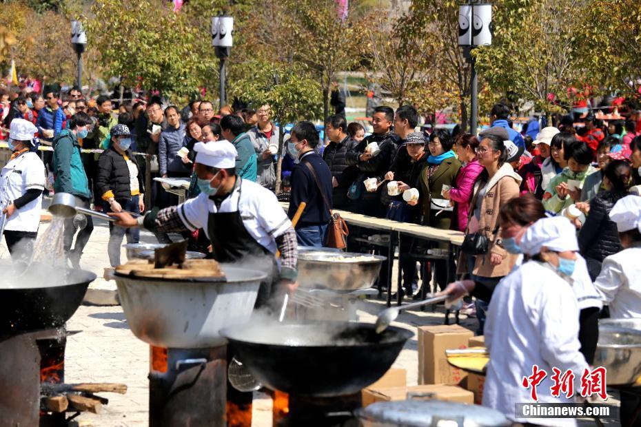 3月25日,河南济源王屋山举办桃花女儿节,为民众提供免费饺子,吸引游客围着广场排队等吃流水席场面壮观。据主办方统计,当天参加免费饺子的民众达三千多人。 中新社记者 王中举 摄