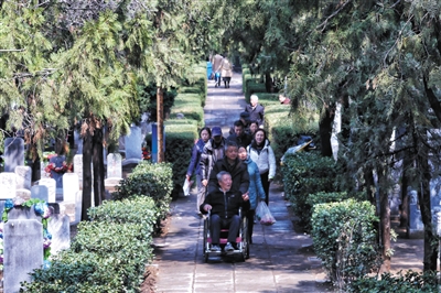 昨日上午9时许,记者在地铁八宝山站看到,每车都有几百人下车,中老年人居多。他们大多手里拎着祭祀用品,跟着人流前往八宝山人民公墓。