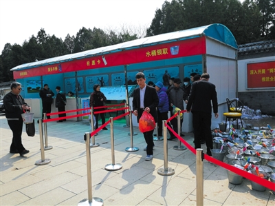 为了提倡文明祭扫,八宝山人民公墓免费为每名市民提供一枝鲜花。负责发放鲜花的工作人员告诉记者,上午10点多钟时领鲜花的人最多,一上午发了几千枝。记者现场看到,盛花的桶已经空了二十几个,还有几十桶鲜花待发放。