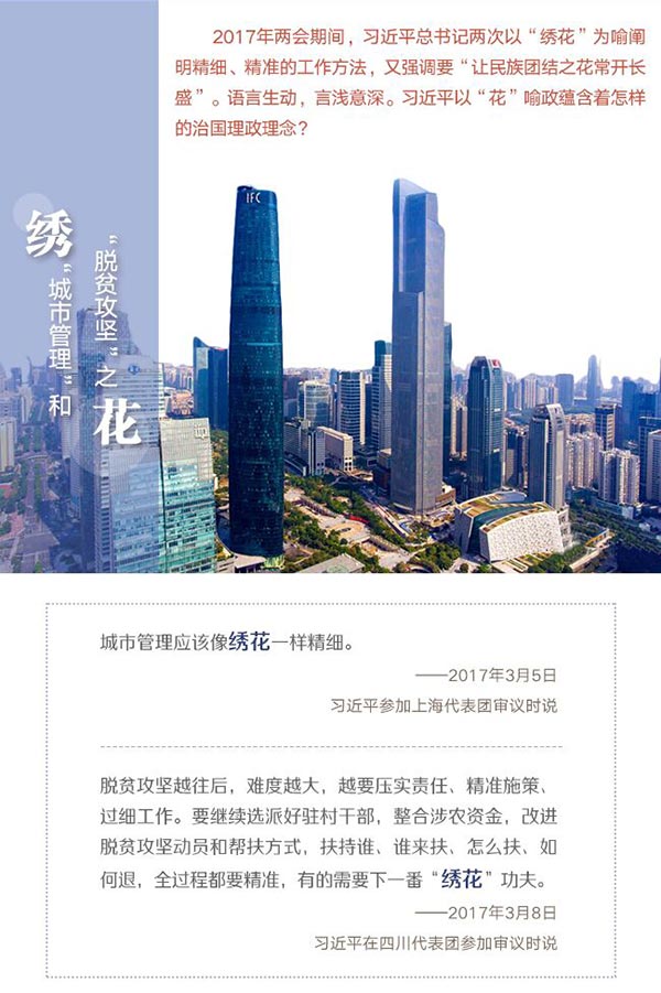 今年两会,习近平两次谈到“绣花”。绣的什么花?