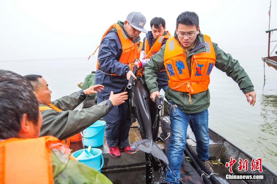 3月25日,在鄱阳湖江西都昌城西码头江豚暂养点,工作人员在网捕江豚,准备外迁到位于湘鄂两省交界的长江何王庙(集成垸)江豚保护区。据介绍,鄱阳湖由于水质优良、环境稳定,共有450余头江豚栖息,约占江豚总数的一半。为了加强江豚的保护,3月15日农业部启动长江江豚拯救行动计划2017年迁地保护项目,截至3月22日,行动队在都昌港附近共起水江豚32头,其中12头被放入网箱暂养,20头被安全释放回湖中。图为工作人员用担架将江豚运送上岸,准备外迁。傅建斌 摄