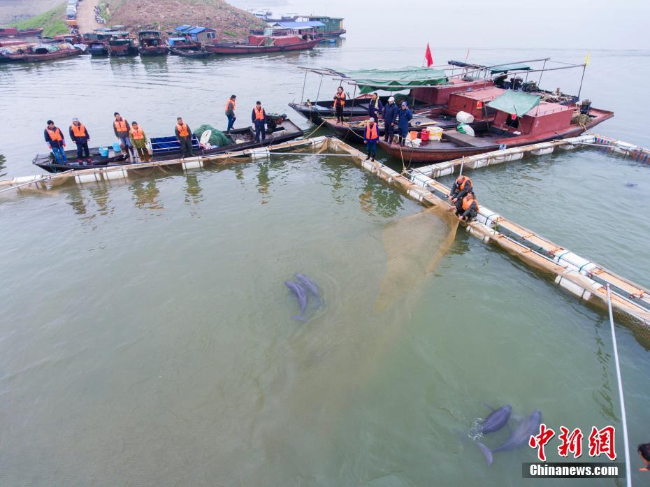 3月25日,在鄱阳湖江西都昌城西码头江豚暂养点,工作人员在网捕江豚,准备外迁到位于湘鄂两省交界的长江何王庙(集成垸)江豚保护区。据介绍,鄱阳湖由于水质优良、环境稳定,共有450余头江豚栖息,约占江豚总数的一半。为了加强江豚的保护,3月15日农业部启动长江江豚拯救行动计划2017年迁地保护项目,截至3月22日,行动队在都昌港附近共起水江豚32头,其中12头被放入网箱暂养,20头被安全释放回湖中。图为鄱阳湖江西都昌城西码头江豚暂养点,航拍工作人员网捕江豚。傅建斌 摄