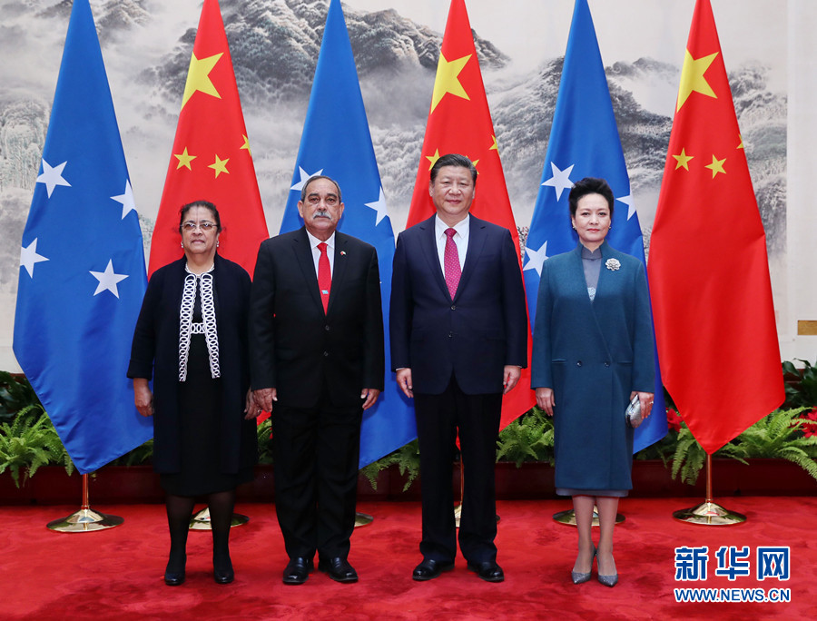 3月27日,国家主席习近平在北京人民大会堂同密克罗尼西亚联邦总统克里斯琴举行会谈。会谈前,习近平在人民大会堂东门外广场为克里斯琴举行欢迎仪式。这是习近平和夫人彭丽媛同克里斯琴总统夫妇合影。新华社记者 鞠鹏 摄