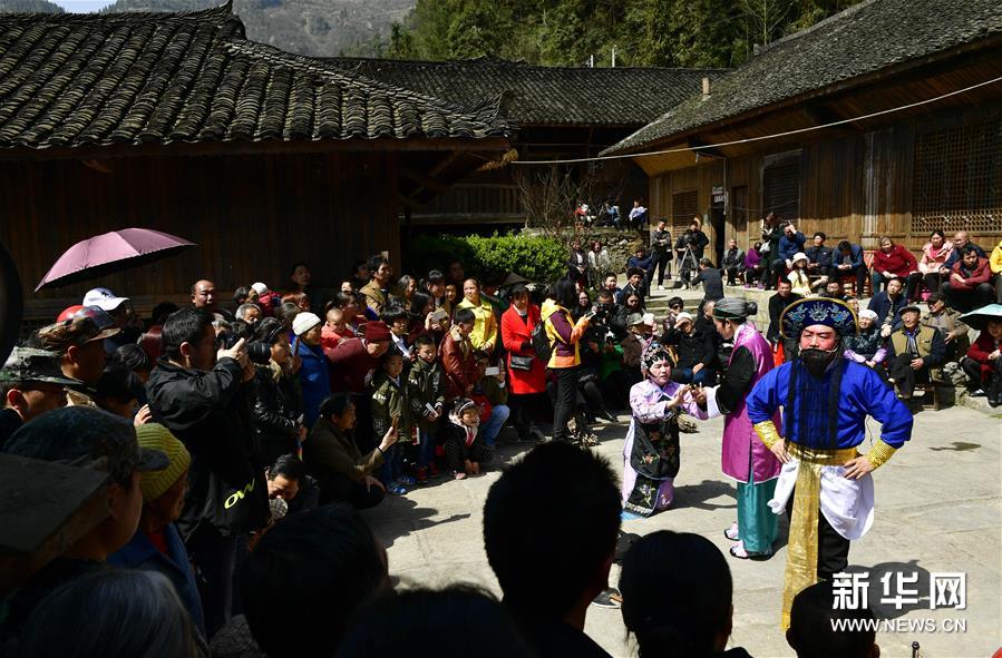3月26日,人们在湖北恩施盛家坝乡小溪古院落里观看南剧表演。 2008年被列入国家级非物质文化遗产名录的南剧一度濒临失传。近年来,经过恩施当地挖掘整理,南剧又重回乡村舞台,成为土苗山乡助推乡村旅游业的新名片。据介绍,南剧是恩施土家族特有的剧种,道白、唱腔多杂有鄂西土家方言土语,风趣幽默、通俗易懂,富有浓厚的生活气息。