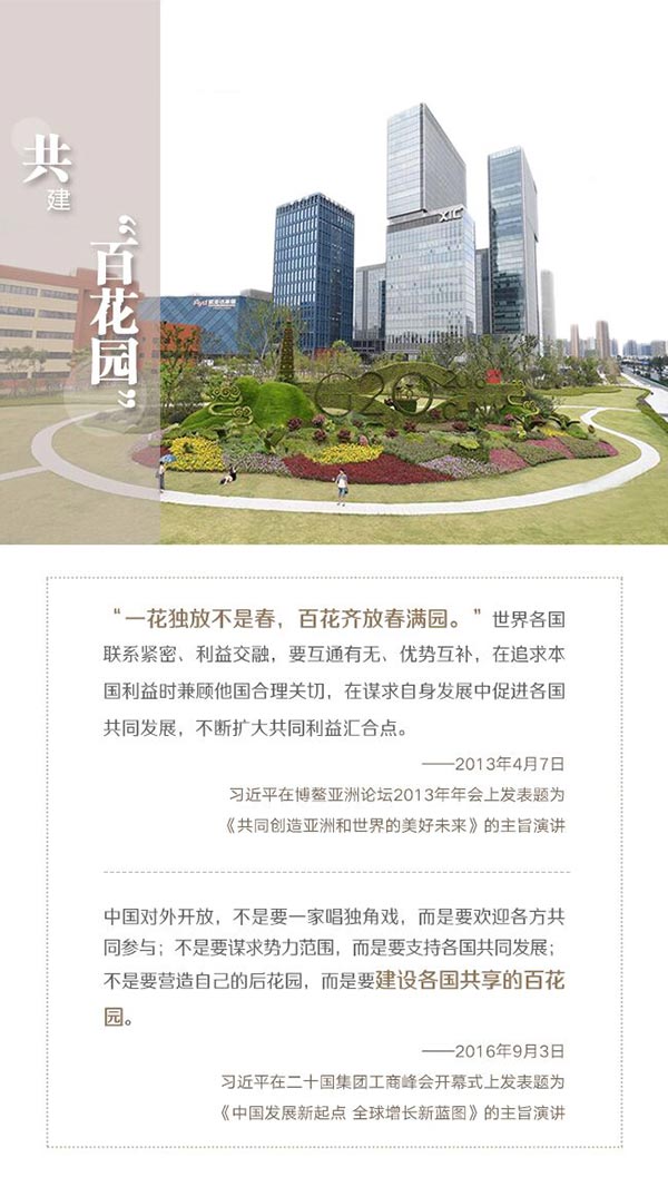 2016年G20杭州峰会上,习近平说,中国对外开放“不是要营造自己的后花园,而是要建设各国共享的百花园”。