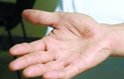 这个周一,5台手术正在等着他。清晨,忙完了病房的查房工作,他来到手术室,准备开始一天的手术。换上手术服,他在刷手池边开始洗手。那双手,看起来甚至不像医生的手,布满老茧、指端粗壮。脊柱外科手术中,经常会用到名叫椎板咬骨钳的手术器械,它可以一点点咬掉患者椎骨上增生的坚硬骨质。咬骨钳有个“小尾巴”,支出来刚好卡到掌根处。刘海鹰的右手因为常年握着这把钳子,在掌根处形成了厚厚的老茧,中间还被“劈”开一道伤口,看着就觉得揪心。这样的老茧一年要掉三四茬,“脱落之后再磨起来一层。”