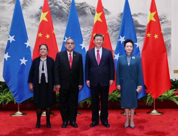 3月27日,国家主席习近平在北京人民大会堂同密克罗尼西亚联邦总统克里斯琴举行会谈。会谈前,习近平在人民大会堂东门外广场为克里斯琴举行欢迎仪式。这是习近平和夫人彭丽媛同克里斯琴总统夫妇合影。新华社记者鞠鹏摄