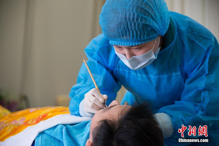 3月29日,福州市殡仪馆举办了一场特别的“殡仪服务观摩日”活动,邀请民众现场观摩殡仪服务演示,推动移风易俗,告别陋习。此次殡仪服务演示以殡仪治丧为主线,现场演示守灵、入殓、告别服务等内容。图为殡仪服务人员为“逝者”整理遗容。中新社记者 李南轩 摄