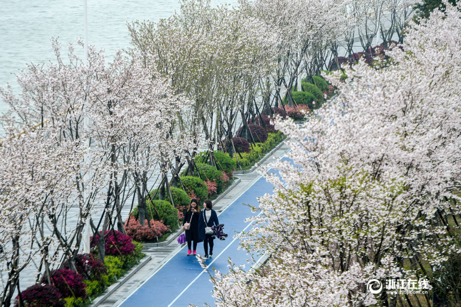 3月30日,杭州滨江最美跑道变身樱花大道,一侧是江景,一侧是繁花,美不胜收。