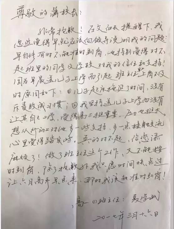 他从来没有写过请假条,这是他第一次写,写这张请假条时,他内心是充满了愧疚感。“儿子今年读高三,是人生中最关键的转折期,我想每天送他上学。”夏老师对记者说,他怕错误了高三这一年,他以后就再也没有机会送儿子上学了。