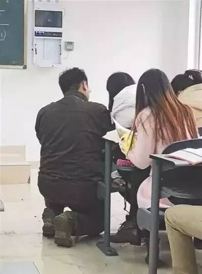 单膝跪地,一手扶在课桌上,解答学生疑惑……