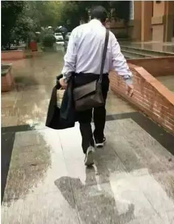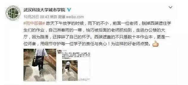 去年10月26日,武汉科技大学城市学院的官方微博发了这样的一条微博:昨天下午放学的时候,雨下的不小,前面一位老师,脱掉西装遮住学生们的作业,自己淋着雨的一幕,恰巧被后面的老师抓拍到,走进办公楼的大厅,因为路滑,还摔碎了自己的杯子……